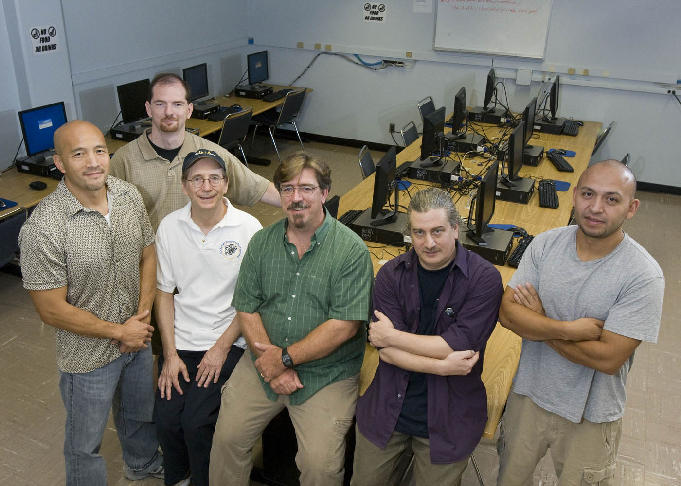 UCLA Todaystory about the discovery of Mersenne prime M-46. People ID, left to right: Charlie Chen, Chris Oberlander, Jim Carter, Edson Smith, Robert Amodeo, Ed Trejo, (Linda Bingham missing). Location: PIC lab.