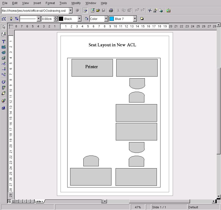 The program is called Draw. This is a misnomer; it is much more an object manipulation program intended for symbolic graphics (organization charts, bar graphs) rather than representational art (e.g. room floor plans). I found it hard to learn how to use it, and to accomplish the assigned task. I was never able to figure out how to turn on the floating toolbars, so as to select a line style, nor how to draw an arc centered on a given point, so I was not able to make the symbol for the room's door. Nonetheless, I did produce a mostly finished plan. As usual with OpenOffice programs, it had an unrecoverable error when exiting (didn't say what the problem was).