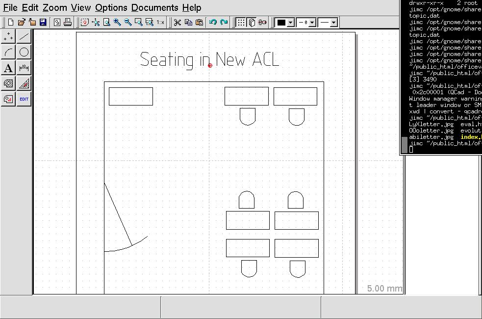 QCad (probably) imitates AutoCad. This is the program I would normally use for an assignment like a floor plan. Unlike with any of the competitors, I was able to finish the whole assignment including drawing the door.