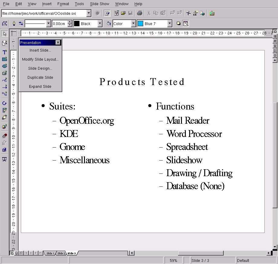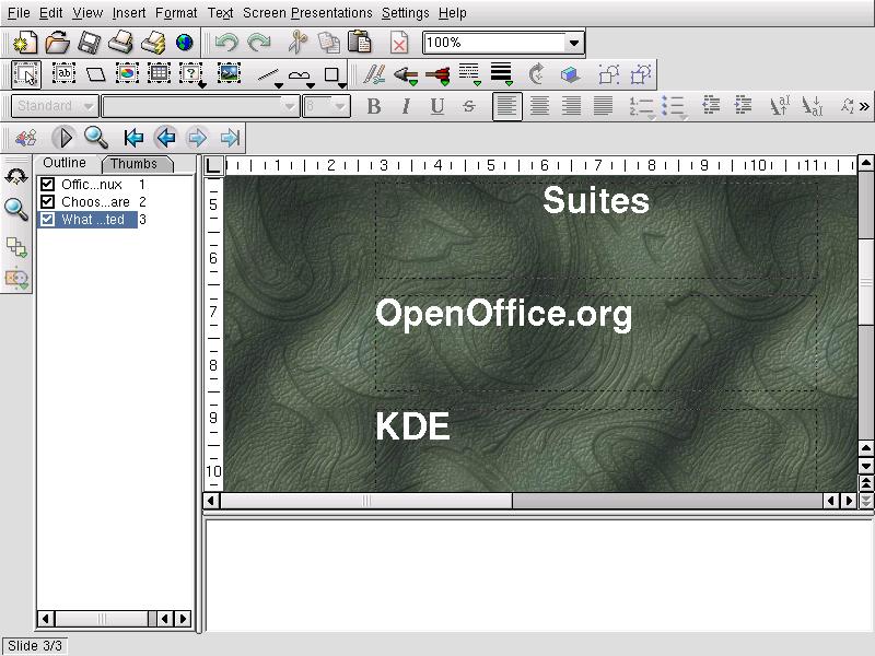 KPresenter is being run under Gnome. Its interface was different from OpenOffice, but once I read the help writeup I was able to use it. I chose the snazzy marbled background (not offered in OpenOffice). This presenter is very object-oriented, in that you create and move text objects, then put the text into them. It has a nice feature to reveal one point at a time in the slide, which I didn't see in OpenOffice. (Maybe it was there but I didn't read enough of the help to find it.) This presentation was successful.