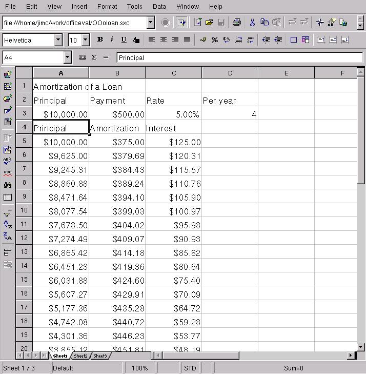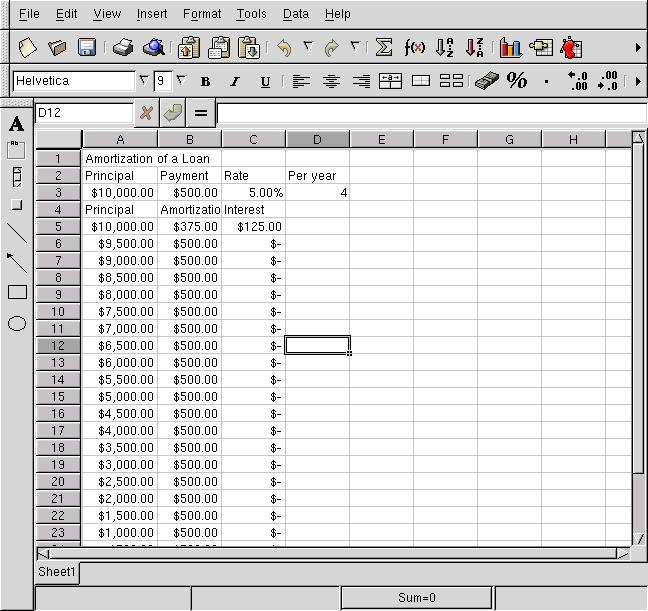 On the loan example, it was easy and convenient to create the spreadsheet. There was a close correspondence between some of the toolbar functions between scalc and gnumeric, leading me to believe that both of them emulate Microsoft Excel closely.