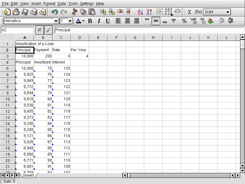 The loan problem: it was simple to set up this spreadsheet and to designate and copy cells appropriately. Gnumeric has one odd quirk: when you change a cell it only partially auto-recalculates; thus you have to repeatedly press F9 (recalculate) until the output cell stops changing. I was not able to discover how to engage complete recalculation.