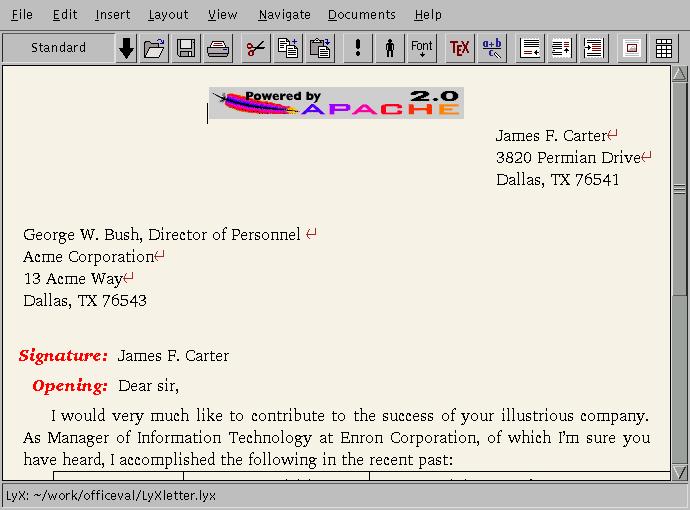 LyX is a kind of front end to the TeX document formatting system; it shows on screen approximately the formatting that will be in the final document. It includes full support for TeX mathematical typesetting. TeX can be converted to HTML (including most but not all of the math) by the Hevea system. I personally use LyX whenever I need to do word processing. LyX was easy to use. It includes a nice letter style. I needed to do some work to figure out how to get wrapped cells in the table (assign a fixed width to the column). I could include the graphical logo but was not able to get it to print on the same page as the text. Apart from this, printing was fine.
