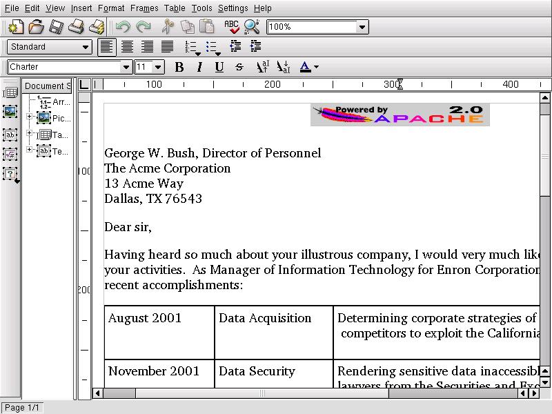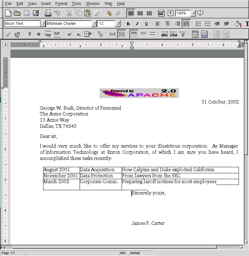 Assignment: Write a business letter to the Acme Corporation asking for employment. Include a table of your projects with three columns listing the title, date and brief description, which should wrap to more than one line. Include a suitable image or graphic. Extra credit: type up your actual resumé.